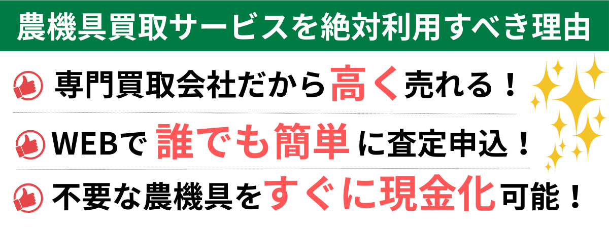 故障している農機具や年式の古いモデルでも、買取可能な業者があります。一括査定で複数社に問い合わせることで、買取対応してくれる業者が見つかる可能性が高まります。